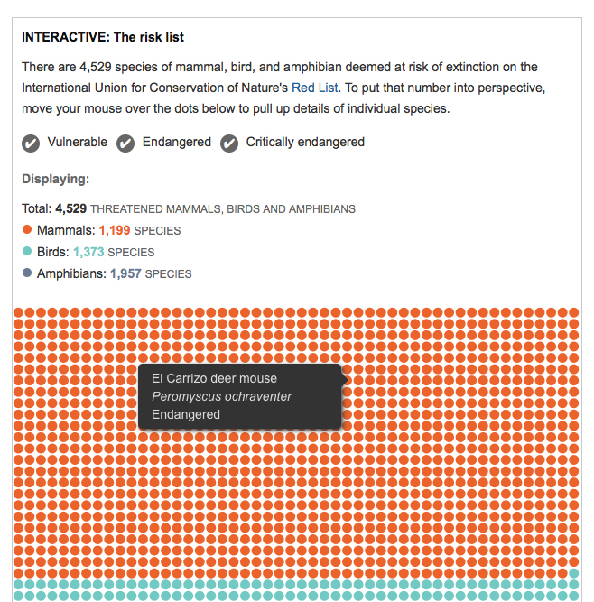 The graphic is about the loss of biodiversity in the world. We visualized threatened species as well as how many species exist and how many are already extinct. More than 90% of the species that have populated Earth during the past four billion years are gone, many of them in mass extinctions. So what remains? A story difficult to visualize due to the extreme uncertainty associated with much of the available data.